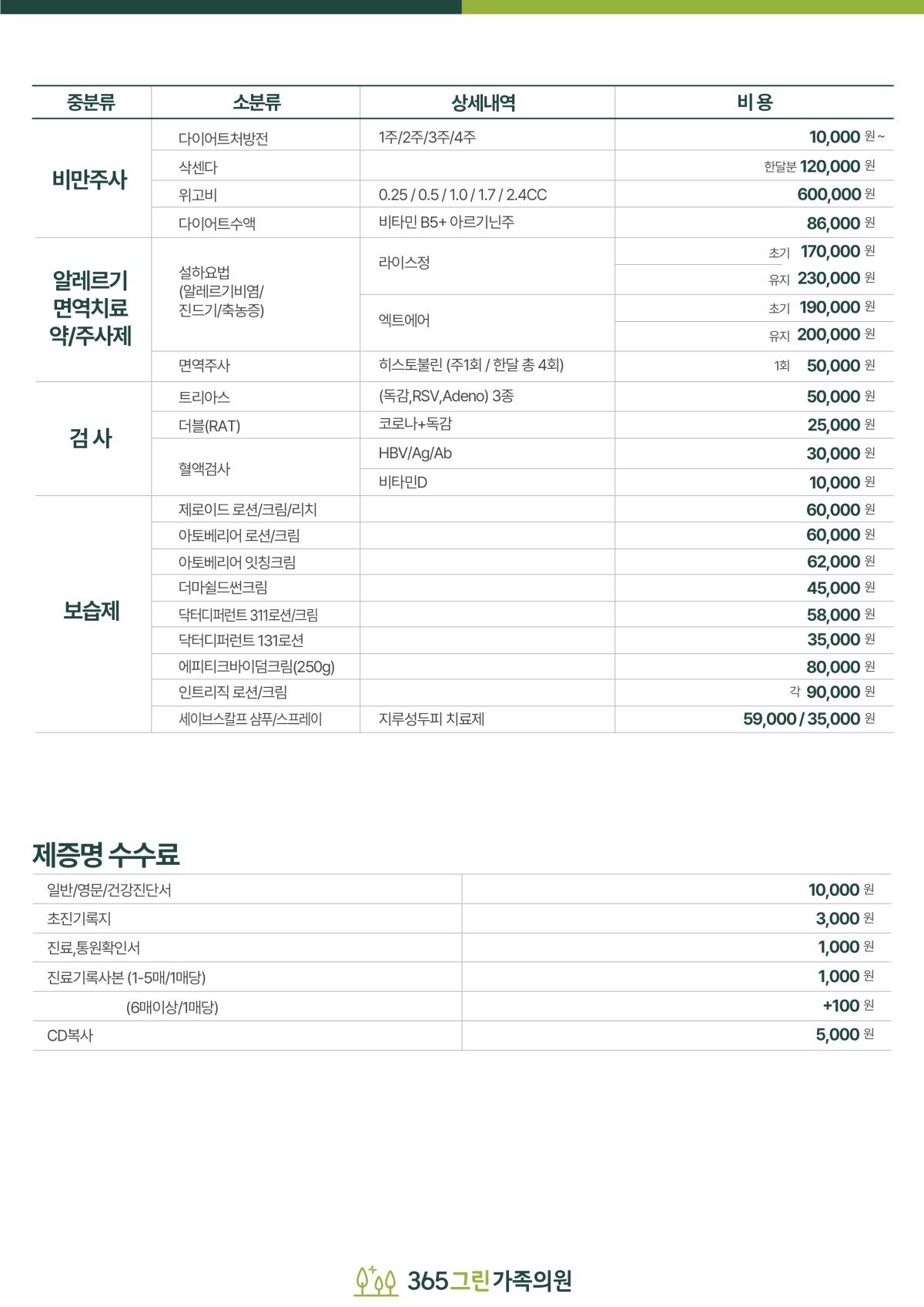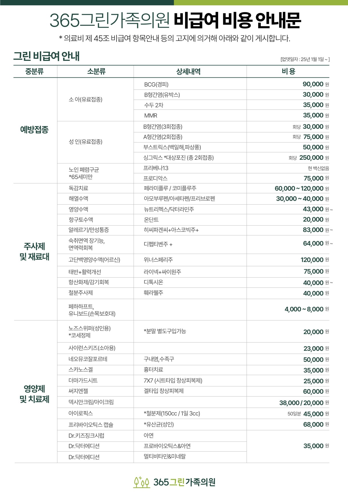 365그린가족의원 비급여 안내